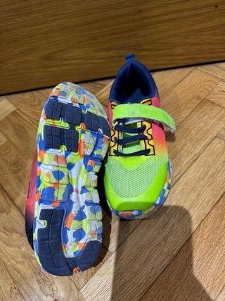 Zapatillas deportivas para niño con un diseño vibrante y llamativo. Talla 29 - Suela de goma con buen agarre. - Cierre de velcro y cordones. - Combinación de colores: verde lima, naranja, azul y rosa.