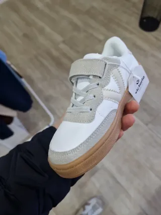 Zapatilla de la marca Victoria, modelo Hielo, en color blanco y detalles en ante gris. Cierre de velcro y cordones. Tallas : 29,31,32,35 - Color blanco y gris. - Cierre de velcro y cordones. - Suela de goma marrón.