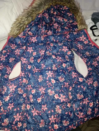 Chaleco para niña en talla 8 años. Un lado es de color rosa con detalles bordados y el otro lado es estampado floral. - Chaleco acolchado. - Estampado floral en azul y rosa. - Cierre de cremallera.