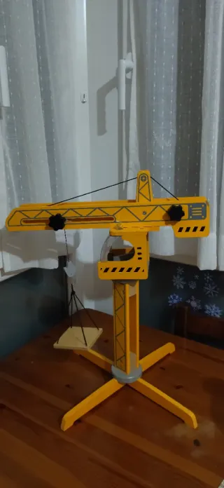 Grúa de juguete de madera para niños. - Diseño de grúa de construcción. - Base en forma de cruz para mayor estabilidad. - Incluye un gancho con cuerda para levantar objetos. Tiene un pequeño rasguño en la parte trasera. Está bien conservada y tiene todavía mucha vida por delante