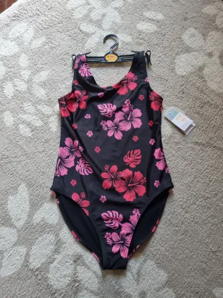 Bañador infantil con un alegre estampado floral. -talla 140 cm - Diseño de tirantes. - Estampado de flores rosas y hojas sobre fondo negro.