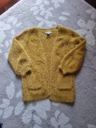 Chaqueta de punto suave y calentita para niña, en un bonito color mostaza. -talla 116 cm - Diseño abierto. - Dos bolsillos delanteros. - Manga larga abullonada.