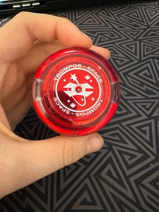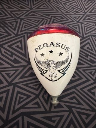 Peonza clásica con diseño de Pegasus. - Cuerpo blanco con detalles en negro. - Ilustración de un pegaso alado y estrellas. - Parte superior con acabado rojo brillante.