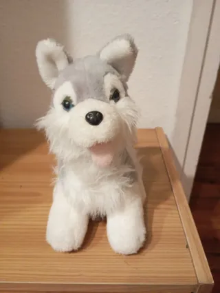 Adorable perrito de peluche con un diseño tierno y suave. - Pelaje de felpa gris y blanco. - Ojos azules. - Nariz negra. - Lengua rosada.