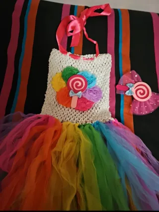 Disfraz de caramelo con falda de tul arcoíris para niña. Incluye un accesorio para el pelo. - Cuerpo de crochet blanco. - Decoración de flor y caramelo. - Falda de tul en varios colores. - Lazos de satén para atar al cuello.