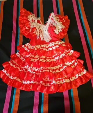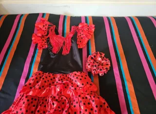 Disfraz de sevillana para niña, ideal para fiestas y eventos. - Vestido rojo con lunares negros. - Mangas voluminosas y volantes. - Incluye accesorio para el pelo a juego. Se ve en las fotos que el bajo esta deshilachado.