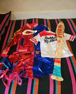 Conjunto de disfraz de Harley Quinn para niña. Incluye varias piezas para un look completo. - Chaqueta roja y azul brillante con detalles dorados. - Collar blanco con la palabra PUDDIN. - Camiseta blanca con Daddy's Lil Monster. - Pantalones cortos rojos y azules brillantes. - Mechones rosas y azules. - Bate hinchable