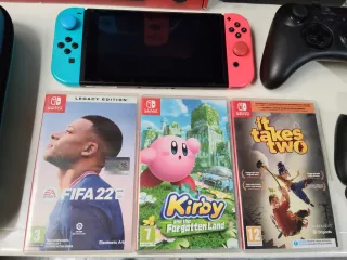 Consola Nintendo Switch con todos sus accesorios originales y varios juegos precio negociable. - Incluye consola, Joy-Cons (rojo y azul), base de carga, agarre para Joy-Cons y cables. - Juegos incluidos: FIFA 22, Kirby y la Tierra Olvidada, It Takes Two. - Incluye mando Pro Controller y mando adicional para Joy-Cons. - Funda de transporte y protector de pantalla. - Mando especial edición Pikachu.
