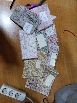 Lote de retales de tela con diferentes estampados y texturas. Ideales para manualidades, patchwork o proyectos de costura. - Diseños florales y geométricos. - Tonos azules y blancos predominantes. - Tejidos de algodón y mezclas.