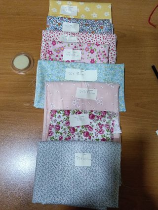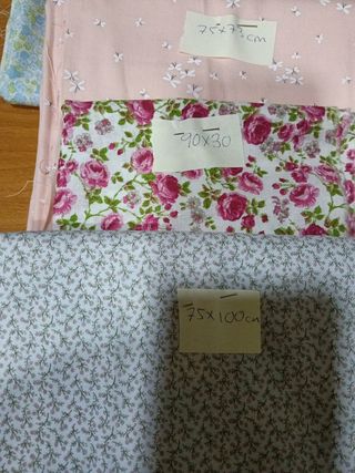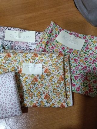 Lote de retales de tela con diferentes estampados, ideales para manualidades o proyectos de costura. - Retal 1: 55x50 cm, fondo amarillo con flores blancas. - Retal 2: 50x70 cm, estampado floral multicolor. - Retal 3: 30x110 cm, fondo blanco con flores rosas y rojas. - Retal 4: 48x65 cm, fondo rosa con flores. - Retal 5: 30x70 cm, fondo azul claro con flores pequeñas. - Retal 6: 75x73 cm, fondo rosa pálido con flores blancas. - Retal 7: 90x30 cm, estampado floral con rosas. - Retal 8: 75x100 cm, estampado floral gris.
