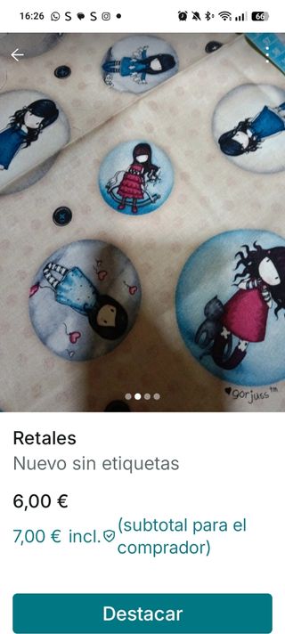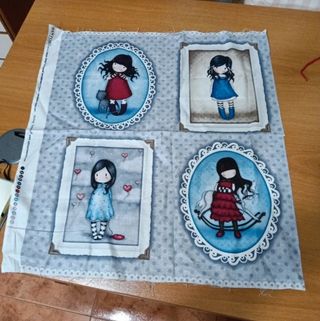 Retales de tela con divertidos diseños de Gorjuss. - Nuevos, sin etiquetas. - Incluye varios círculos con ilustraciones. - Diseño de la marca Gorjuss.