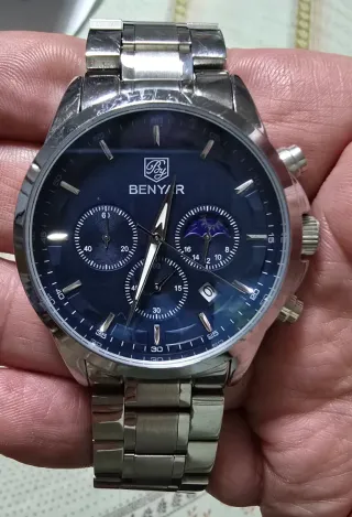 Elegantes relojes analógicos con movimiento de cuarzo. - Esfera azul. - Correa de metal plateado. - Diseño con múltiples subesferas y ventana de fase lunar -Están como nuevos