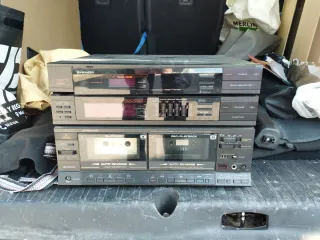 Sistema de audio Pioneer con varias unidades. - Unidad superior: Sintonizador de radio. - Unidad central: Ecualizador gráfico de 5 bandas. - Unidad inferior: Doble pletina de casete con auto reverse.
