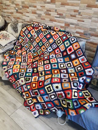Manta de crochet hecha a mano con cuadrados de colores. - Diseño vibrante y alegre. - Ideal para sofá o cama. - Tacto suave y cálido.