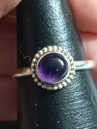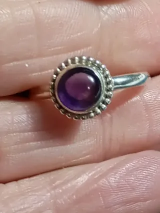 Elegante anillo de plata de ley con una piedra central de amatista. - Diseño con detalles de bolitas alrededor de la gema. - Montura de plata 925.
