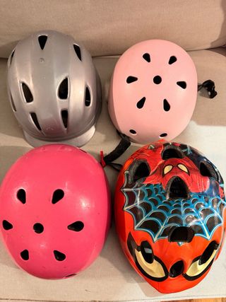 Conjunto de cuatro cascos para niños, perfectos para patinar o montar en bicicleta. Incluye un casco con diseño de Spiderman. - Casco plateado - Casco rosa - Casco rosa brillante - Casco con diseño de Spiderman