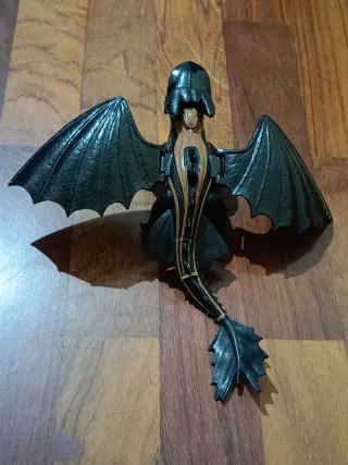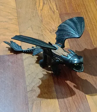 Figura de Chimuelo (Toothless) de Cómo Entrenar a tu Dragón. Modelo con alas grandes articuladas (posicionables para vuelo), cuerpo negro brillante, detalles marrón en espalda/cola, ojos verdes, boca abierta con dientes. Articulación en cuello, patas, cola y alas. Le falta la pieza que disparaba plasma por la boca (accesorio perdido), pero el resto está en muy buen estado: sin roturas, pintura perfecta (ver fotos detalladas). Ideal para: Coleccionistas de la saga. Niños fans de dragones. Juego o decoración. Medidas aproximadas: ≈ 20-25 cm largo con alas abiertas (alas desplegables). ¡Buena figura articulada a precio ganga!