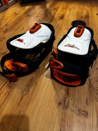 Fijaciones Nidecker para snowboard. Tienen trote pero aún funcionales. Usadas con botas 44-45, con rango de ajuste para diferentes tallas y medidas. Incluyo tornilleria