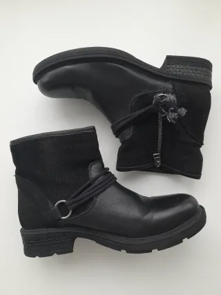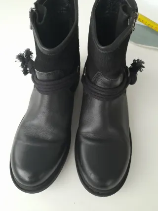 Botines de estilo motero en color negro. - Cierre con cremallera lateral. - Detalle de tiras cruzadas con anilla metálica. - Tacón bajo y suela gruesa.