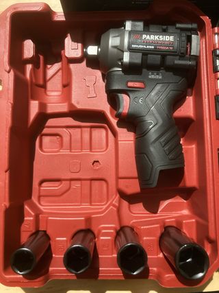 Pistola de impacto Parkside Performance X12. 4 niveles de apriete (85/125/200/300nm). Hasta 350nm cin la bateria de 5ah. - Incluye maletín rojo y negro de plastico. - Incluye adaptador para puntas de atornillador. Para poder usarlo como atornillador. - Incluye 4 vasos de impacto (17, 19, 21, 23). - Motor Brushless. - Cargador y bateria perfomance NO incluidos. Serian 25€ mas