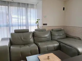Sofá chaise longe eléctrico de diseño moderno. - Tapicería de cuero. - Color gris. - con puffs /taburetes incorporados - 3 años de uso, en perfectas condiciones - medidas aproximadas del sofá en una de las fotos - Solo venta en persona