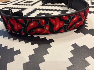Correa ajustable para guitarra o bajo con un divertido diseño de pimientos rojos sobre fondo negro. Fabricada con materiales resistentes y acolchado para mayor comodidad. - Diseño vibrante de pimientos. - Materiales duraderos. - Hebillas de ajuste. -Cierres de seguridad.