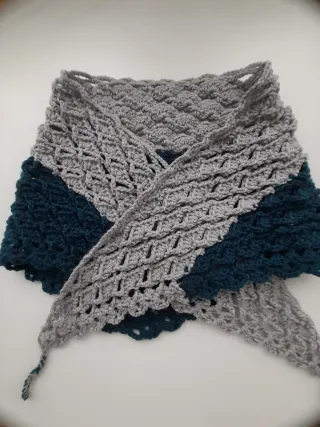 Preciosa pañoleta o toquilla tejida a mano, ideal para niñas. - Diseño en forma de pico. - Combinación de colores gris y azul pato oscuro - Acabado con puntilla. - Textura suave y cálida. Lana - lana