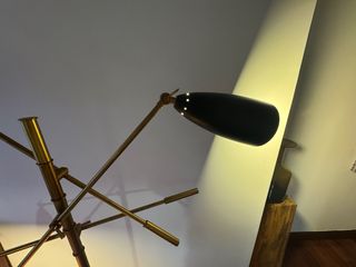 Elegante lámpara de pie con tres brazos ajustables. - Diseño moderno y funcional. - Base circular y estructura metálica. - Acabado en dorado y negro.