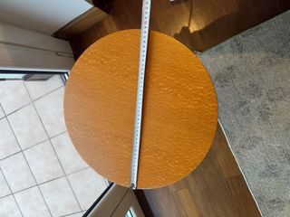 Elegante mesa auxiliar con un diseño único. - Tablero redondo en tono naranja. - Base con patas curvas en acabado dorado. - Detalles metálicos y de madera.