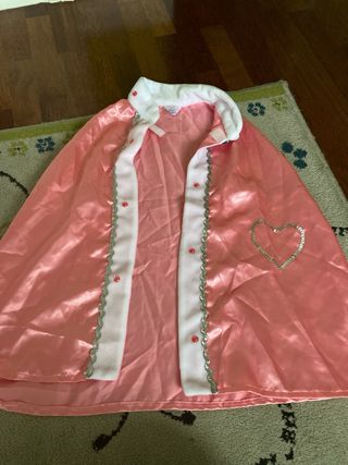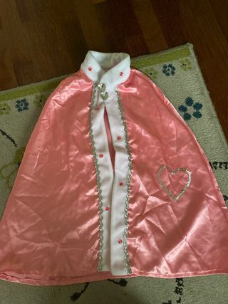 Capa de disfraz en color rosa, ideal para sentirse como una princesa. Perfecta para juegos y fiestas. - Detalle de peluche blanco en cuello y borde. - Adornos de pedrería rosa y plateada. - Cierre con dos corazones plateados. - Corazón plateado con lentejuelas en un lateral.