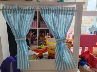 Divertida cocina de juguete de IKEA, perfecta para horas de juego. - Diseño blanco y moderno. - Incluye accesorios como cesta, platos y utensilios. -En perfecto estado - Pizarra trasera como nueva - Cortinas de tela