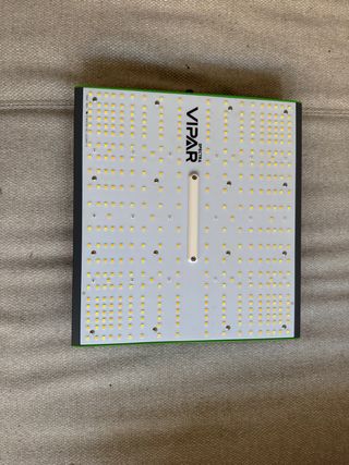 10 Paneles de luces LED Viparspectra P600. - Diseño cuadrado con marco verde. - Superficie blanca con múltiples diodos LED amarillos. - Barra central blanca. 20€ por luz