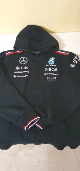 Sudadera con capucha de la escudería Mercedes-AMG Petronas Formula One Team, con diseño inspirado en la temporada. Oficial 100%. - Logo de Mercedes-Benz y Petronas. - Logos de patrocinadores: INEOS, TeamViewer, Hewlett Packard Enterprise, UBS, Crowdstrike, Snapdragon. - Detalles de rayas en cuello y puños. - Colaboración Mercedes-Benz y Tommy Hilfiger. Puesta solamente en 1 ocasión. *Escríbeme para más detalles.