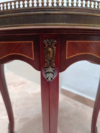 Elegante mesita auxiliar con un diseño clásico y refinado. Su superficie de mármol le da un toque de distinción. - Tablero ovalado con incrustaciones. - Patas de madera con detalles. - Borde metálico decorativo.