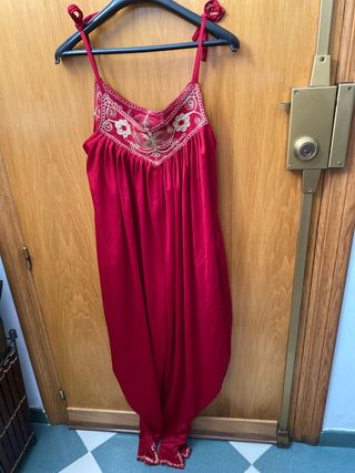 Mono de estilo árabe con un diseño único. - Color rojo vibrante. - Detalle de bordado dorado en el escote. - Tirantes con lazada. - Pantalón tipo bombacho.con bolsillos y cintiron