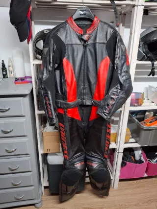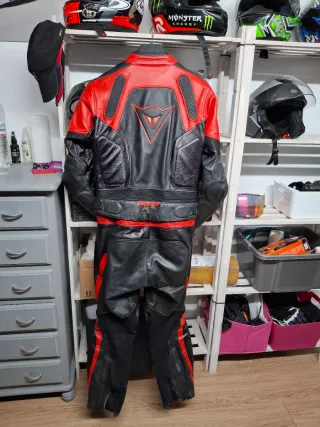 Mono de cuero Dainese de dos piezas en negro y rojo. Ideal para motociclismo. - Chaqueta y pantalón. - Diseño deportivo. - Cierre de cremallera, talla 52 el mono tiene su tiempo, tenía partes blancas y con tinte de piel las hice negras ideales para tandas o kàrting, no tiene nada roto , ni roces.