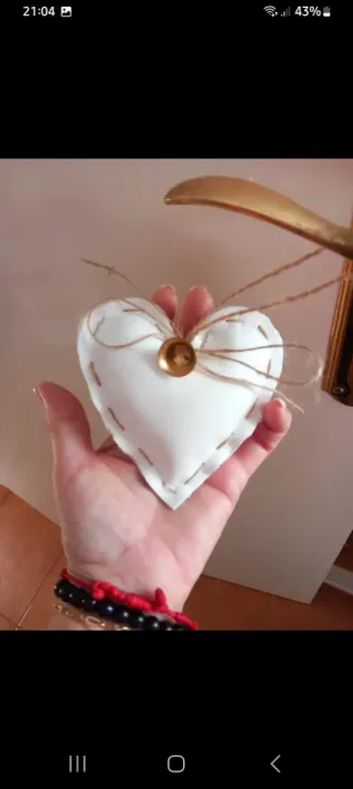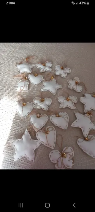 Conjunto de adornos navideños hechos a mano, perfectos para decorar tu árbol o tu hogar. - Diseños variados: estrellas, corazones y casitas. - Acabado en polipiel blanca con detalles dorados. - Incluyen hilo para colgar. El precio es por unidad