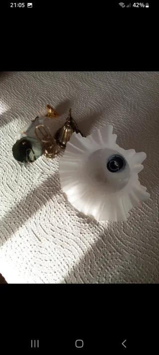 Preciosa lámpara de estilo vintage con un diseño único. - Pantalla con acabado blanco y detalles dorados. - Materiales de cristal y metal.