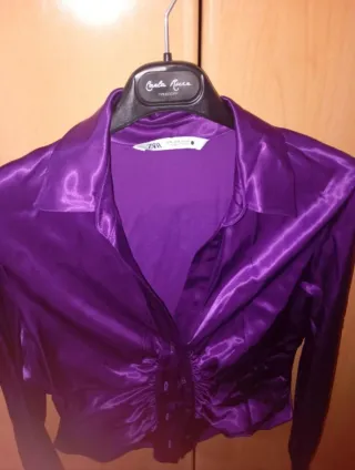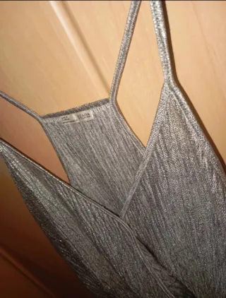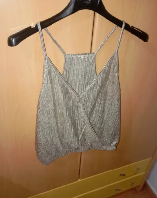 Elegante top de Zara con un acabado brillante que combina tonos plateados. Su diseño cruzado y tirantes finos le dan un toque sofisticado. - Tejido con textura. - Diseño cruzado en la parte delantera. - Tirantes finos ajustables.