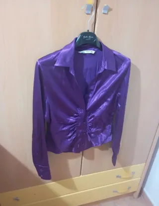 Camisa de vestir con un diseño moderno y sofisticado. - Tejido satinado brillante. - Detalle de fruncido en la parte delantera. - Cierre de botones. - Mangas largas con puños abotonados.