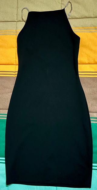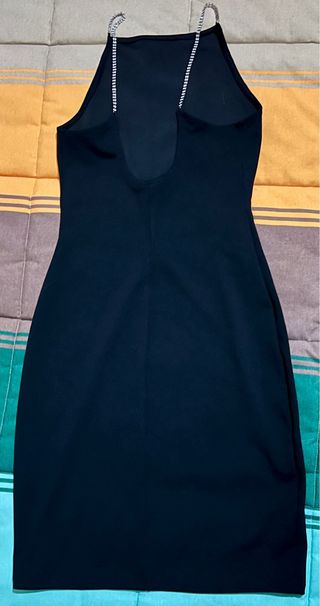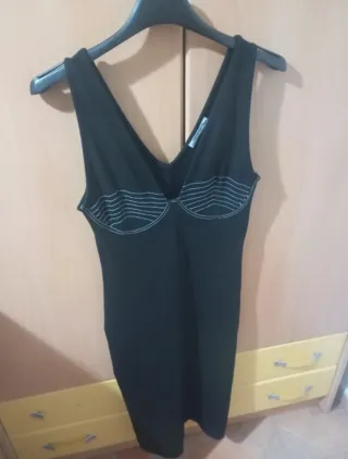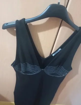 Vestido negro de Zara con escote pronunciado y detalle de costuras. - Diseño sin mangas. - Costuras decorativas en el pecho. - Largo.