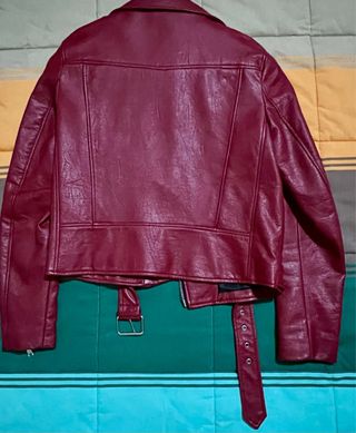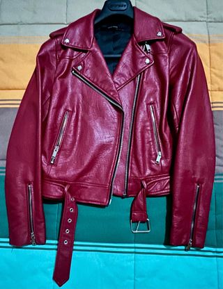 Chaqueta estilo motero de Zara en color rojo. - Diseño con cremalleras. - Cinturón ajustable en la parte inferior.