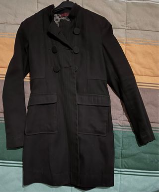 Abrigo infantil de color rojo, ideal para niñas de 2 años. Presenta un diseño clásico con cuello redondo y cierre de botones. - Detalle de encaje y lazo en los bolsillos delanteros. - Tres botones frontales. - Cuello redondo. Restos tienda.
