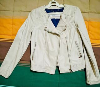 Chaqueta estilo motero en color beige. Diseño moderno con cremalleras. - Cuello asimétrico. - Cierre de cremallera. - Bolsillos con cremallera. - Detalle de costuras acolchadas en hombros y mangas.