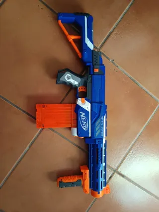 Pistola de juguete Nerf Retaliator de color azul y naranja. Incluye cargador. - Diseño inspirado en armas de asalto. - Empuñadura táctica. - Cargador extraíble sin balas para disparar.
