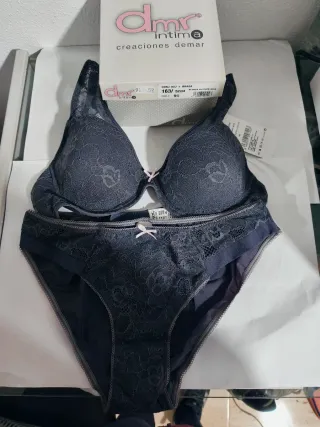 Conjunto de lencería de la marca DMR. Restos de tienda - Sujetador con detalles de encaje. - Braga a juego con detalles de encaje. - Adorno de lazo rosa en ambas piezas.