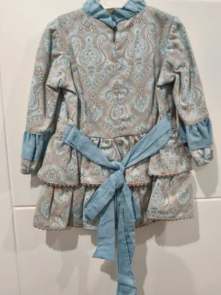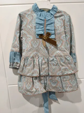 Conjunto de vestido y pololo para niña con un bonito estampado. Marca tartaleta, talla 6 meses . Restos de tienda. - Vestido con cuello volante y lazo. - Manga larga. - Pololo a juego. - Estampado paisley en tonos azules y beige.