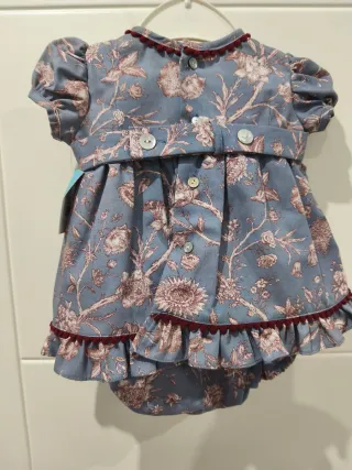 Conjunto de vestido y braguita para bebé. Precioso estampado floral. Talla 6 meses. Marca tartaleta. Restos de tienda. - Vestido con mangas abullonadas. - Volantes blancos con detalle de puntitos. - Lazos de terciopelo. - Braguita a juego.