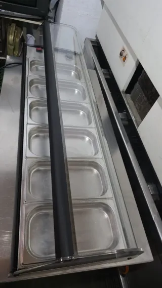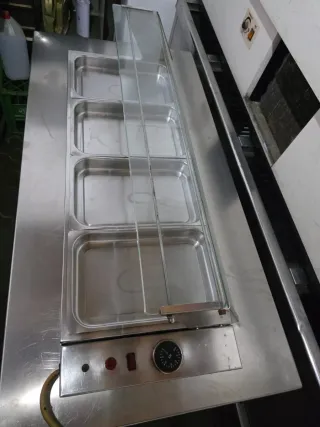 Vitrina de tapas caliente con varios compartimentos. - Estructura de acero inoxidable. - Cubetas de acero inoxidable. - Protector de cristal curvo.