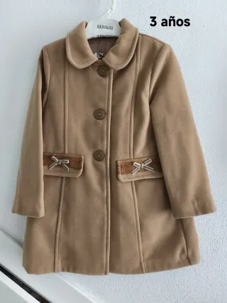 Abrigo de niña en color camel, ideal para los días más frescos. Presenta un diseño clásico con cuello redondo y cierre de botones. - Detalle de bolsillos con lazo. - Talla 3 años. Marca Alber. Restos de tienda.